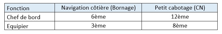 Pour une navigation au petit cabotage (CN), le chef de bord est en 12ème catégorie et l’équipier est en 8ème catégorie. Pour une navigation au bornage (NC), le chef de bord est en 6ème catégorie et l’équipier en 3ème catégorie.